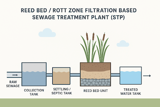 A Reed Bed Sewage Treatment Plant (STP), also known as a Root Zone Filtration System or Constructed Wetland System, is a natural, eco-friendly, and low-cost method for treating domestic or organic wastewater.